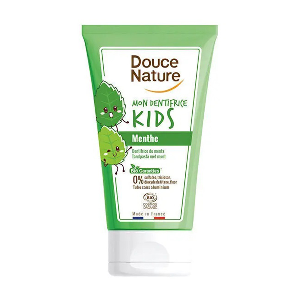 Dentifrice Menthe 50ml, formule sans fluor et adaptée aux enfants de 3 à 10 ans. A la silice minérale, à l’aloé vera.