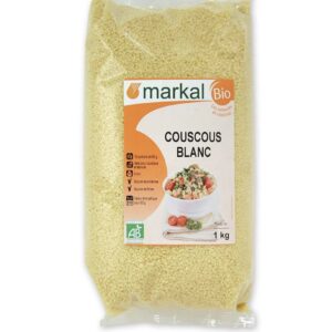 Le couscous blanc est obtenu à partir de semoule de blé dur blanche et d’eau. Les grains obtenus sont ensuite précuits et séchés. La couleur du couscous blanc varie du jaune clair au blanc crème.  Contenance : 1kg